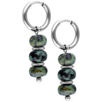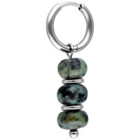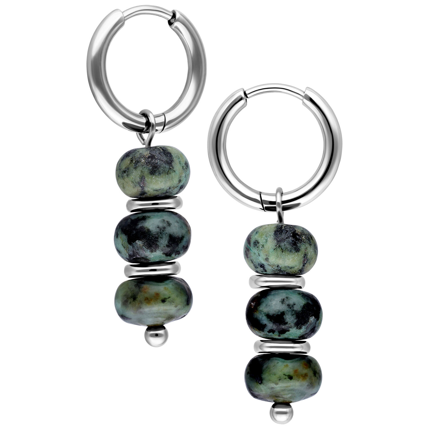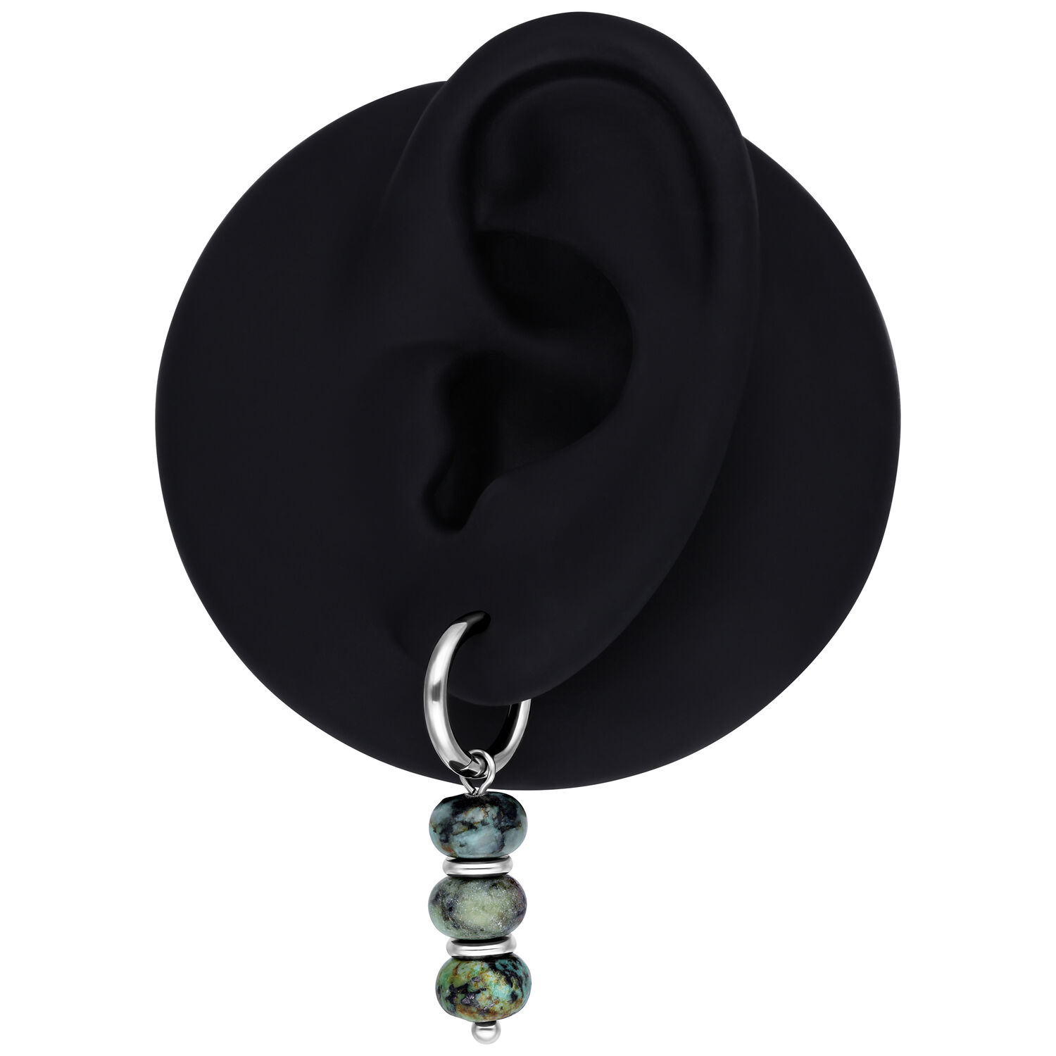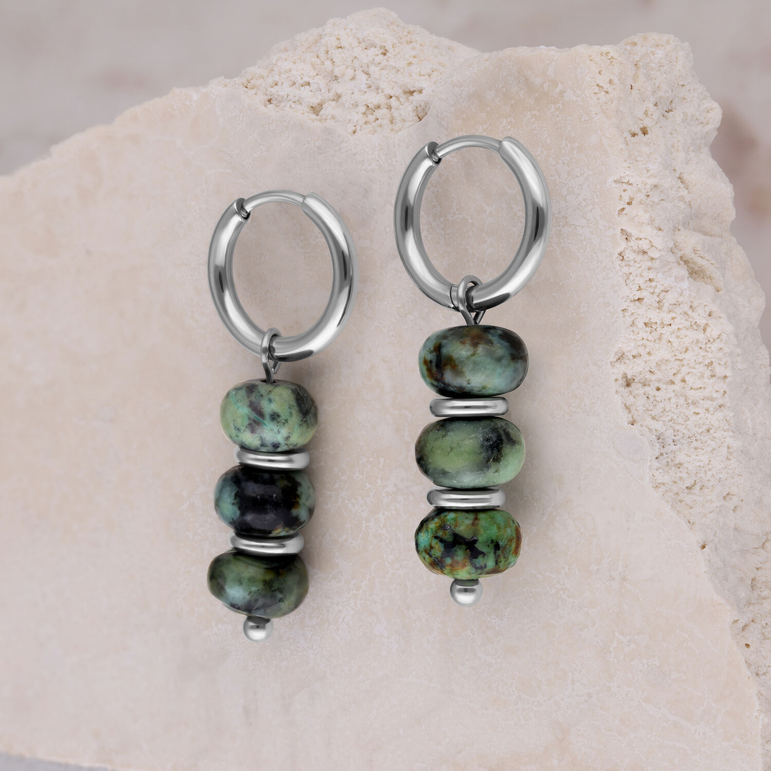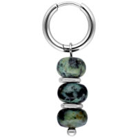 The African Turquoise Bubble Hoops feature a balanced combination of clean metal shapes and naturally inspired stone elements. Multiple rounded african turquoise beads are arranged vertically, creating a calm, organic look with subtle movement.