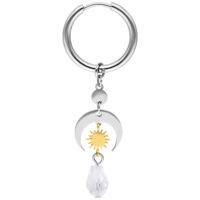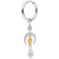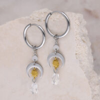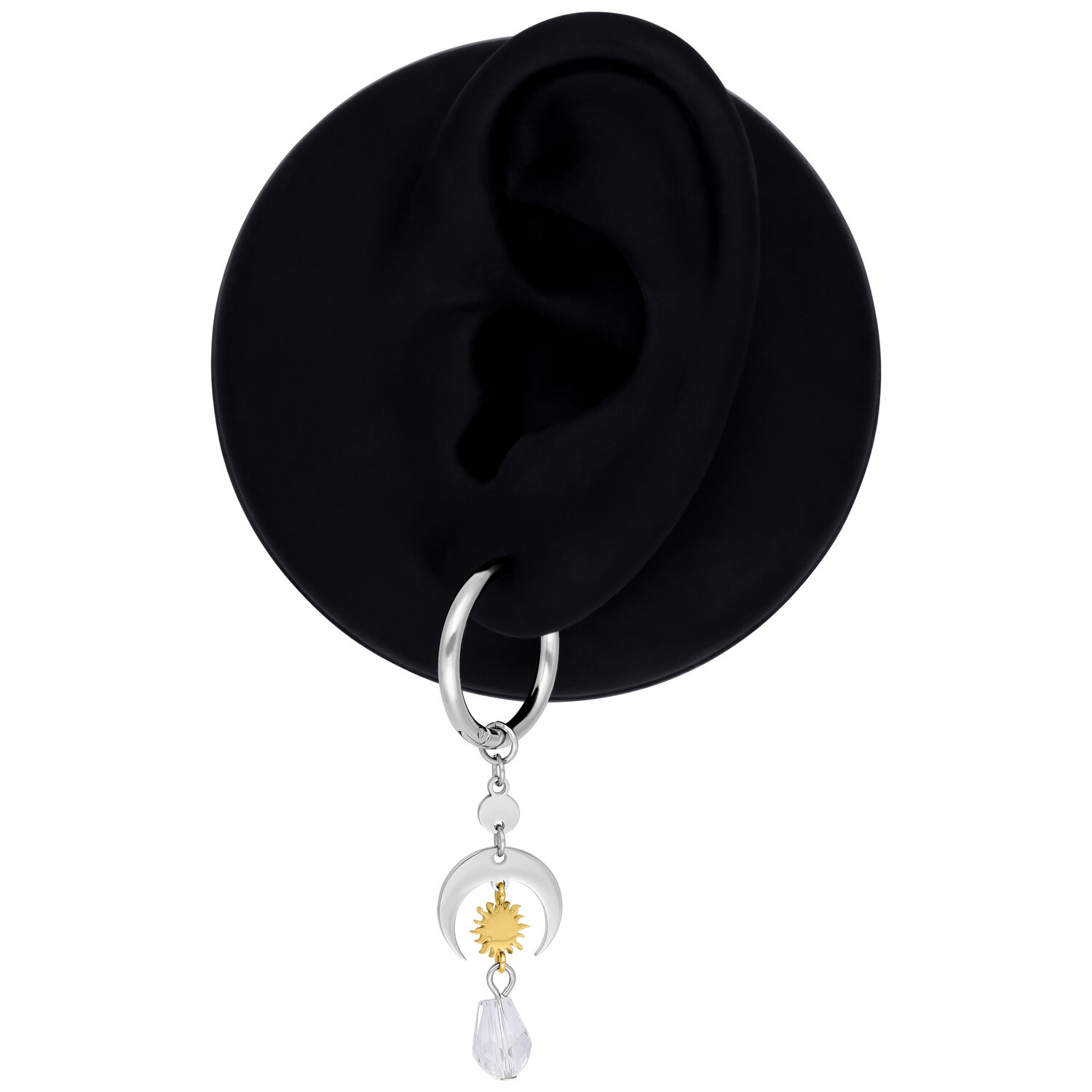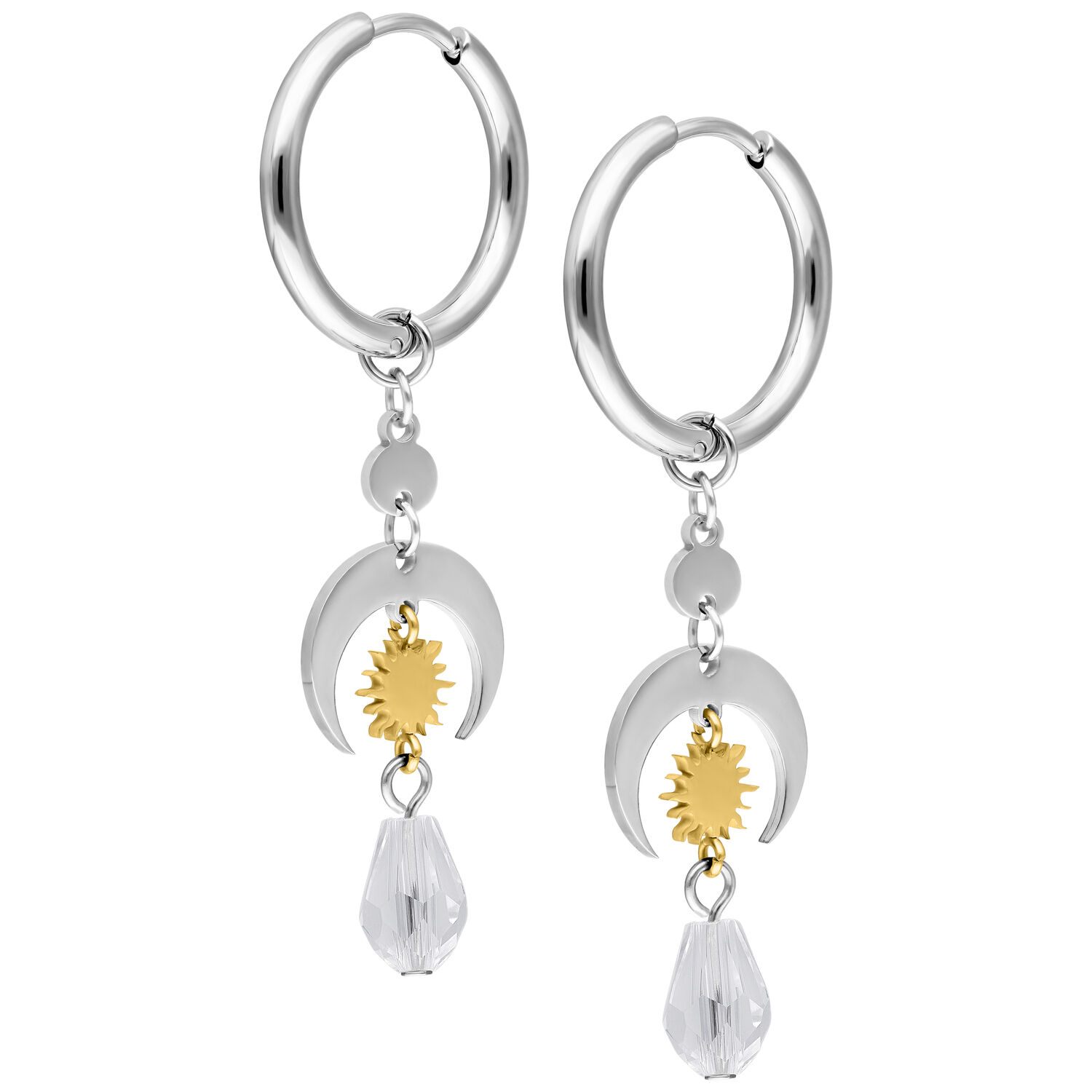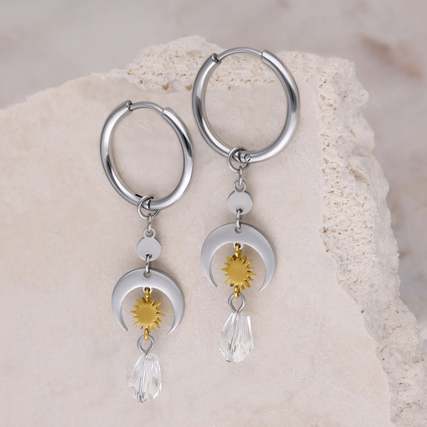 The Celestial Light Hoops combine clean metal shapes with symbolic, celestial-inspired elements. Beneath the classic hoops, a layered design unfolds featuring an open crescent moon, a finely detailed sun element in a gold-toned finish, and a transparent faceted drop that softly reflects light.