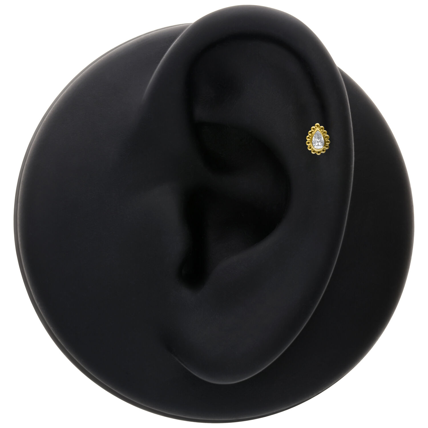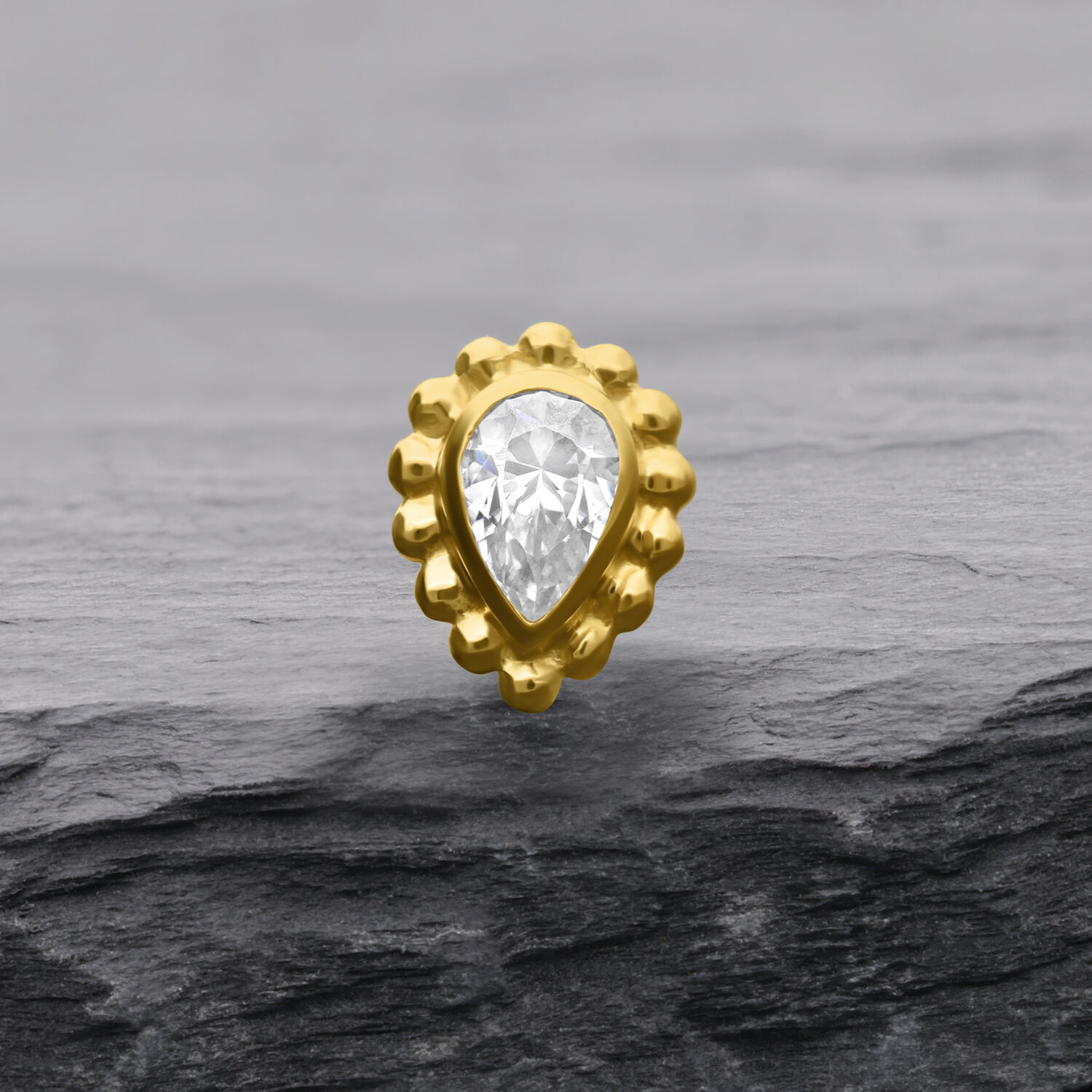 The Crystal Drop Attachment from the Wildcat Collection pairs polished 14 karat (585) yellow gold with a sparkling, teardrop-shaped crystal. Designed specifically for the Perfect Fit Labret (14K), this elegant and feminine piece measures 3.7 x 4.9 mm and weighs 0.14 g. A true eye-catcher that offers both luxurious style and lightweight comfort.