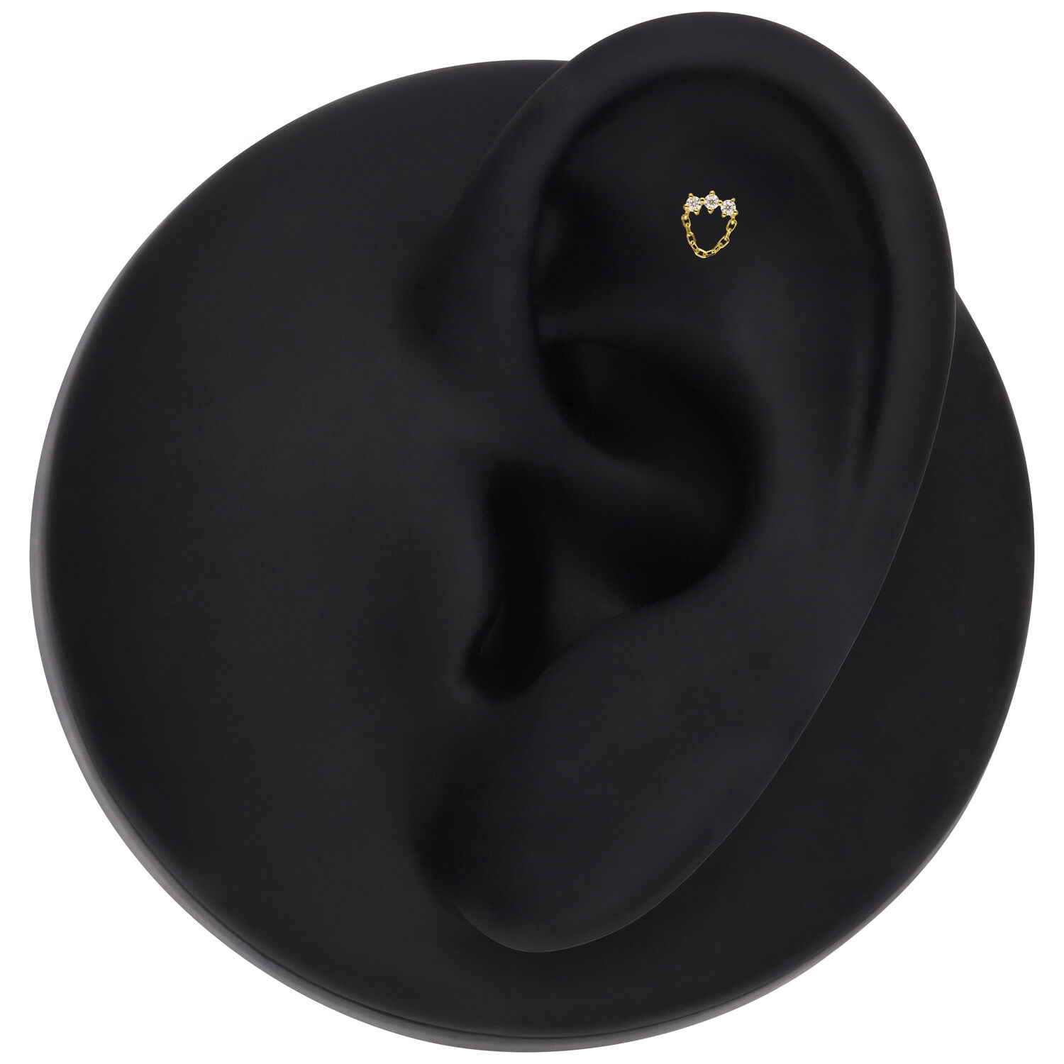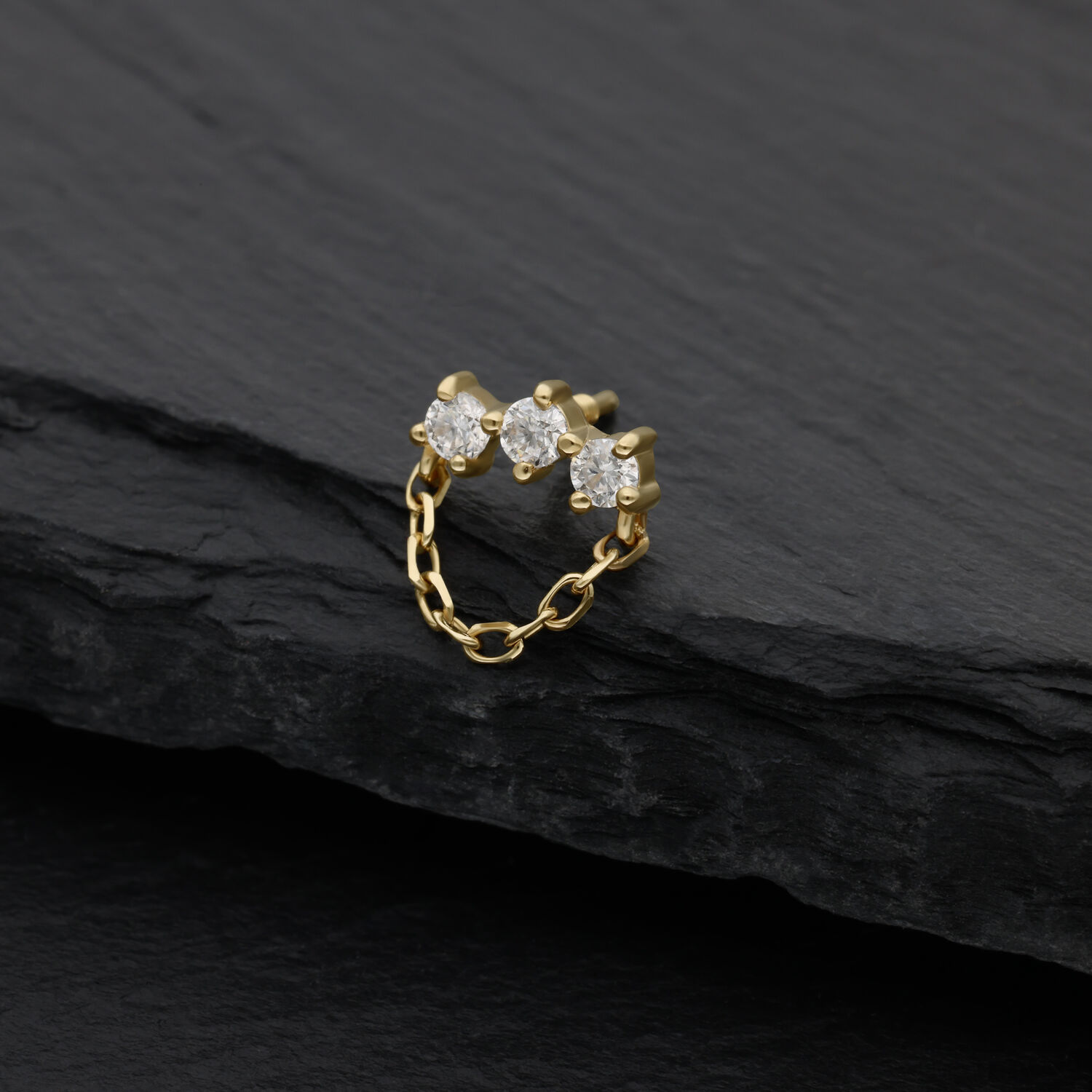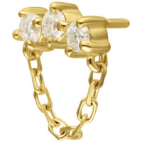 The 14K Perfect Fit Moissanite Bow with Hanger Attachment blends contemporary style with refined luxury. Crafted from high-quality, polished 14-karat (585) yellow gold, this attachment features three brilliant-cut Moissanite stones connected by a delicate gold chain, creating a sophisticated balance of texture and sparkle.
