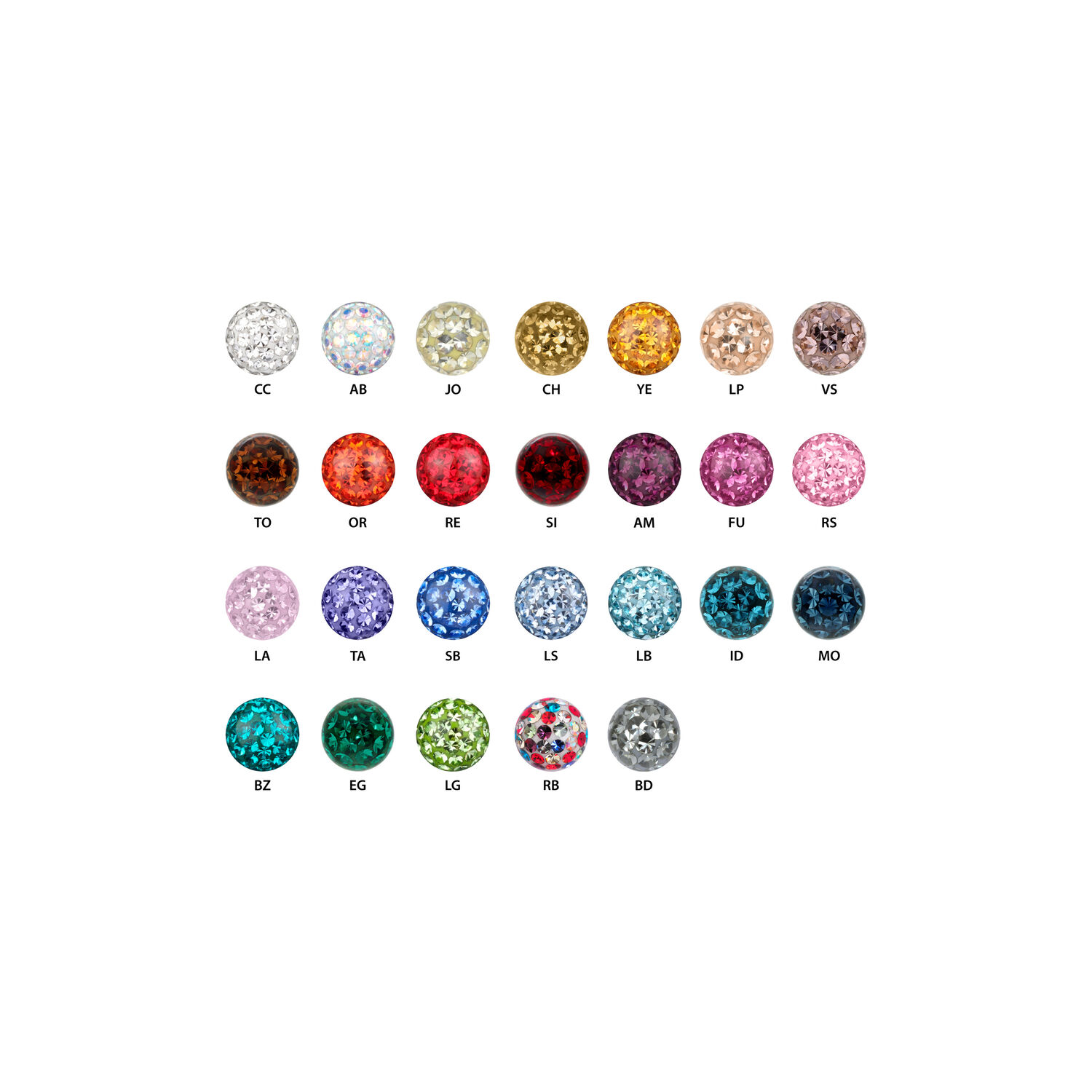 The Sealed Multi Jewelled Ball, adorned with numerous high-quality crystals, is available for 1.2 mm threads in sizes 3.0 and 4.0 mm, and for 1.6 mm threads in 4.0, 5.0, 6.0, 8.0, and 10.0 mm. A protective epoxy resin coating ensures that none of the crystals can come loose!