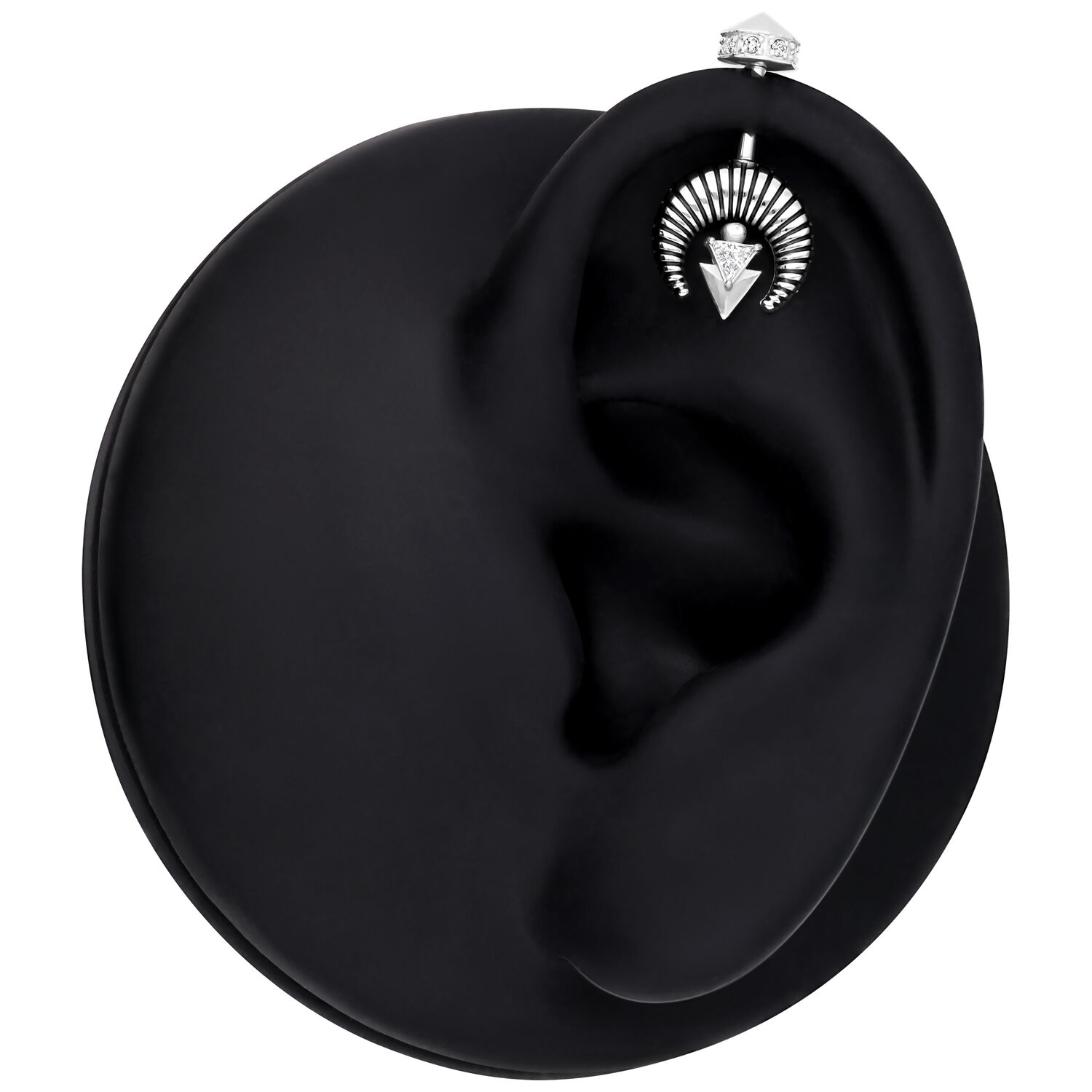 This exceptional piercing jewelry for the vertical helix features a modern, architectural-inspired design. At its center is a sparkling, triangle-shaped zirconia, framed by a bold, ribbed half-circle element. The look is completed with a geometric, downward-pointing arrow motif – a stylish accent with a clean, structured aesthetic. The internally threaded top piece is faceted and adorned with small zirconia stones – a refined eye-catcher for those who love distinctive designs.