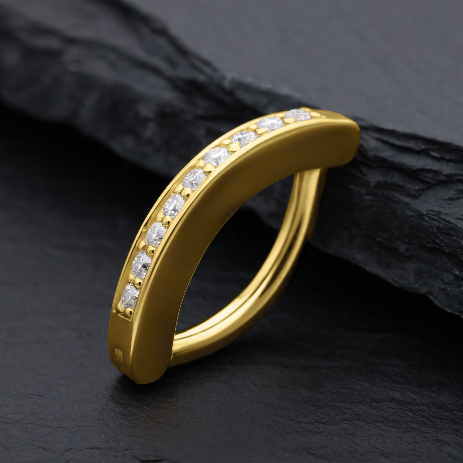 Our luxurious belly button piercing made of 14K yellow gold – the 14K Moissanite Crystal Jewelled Belly Arch Clicker combines elegant design with radiant sophistication.