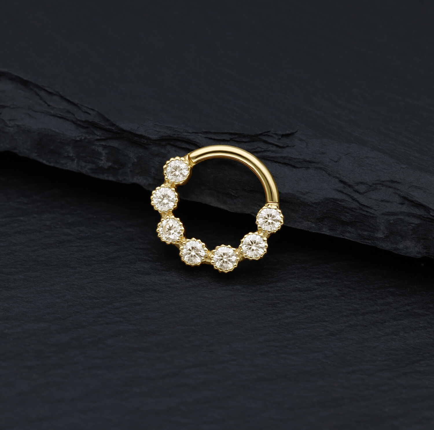 The 18K Rounded Moissanite Crystal Ring embodies pure elegance and brilliant craftsmanship. Made from solid 18-karat gold and adorned with round-cut Moissanite crystals, this clicker adds a sophisticated sparkle to any piercing.