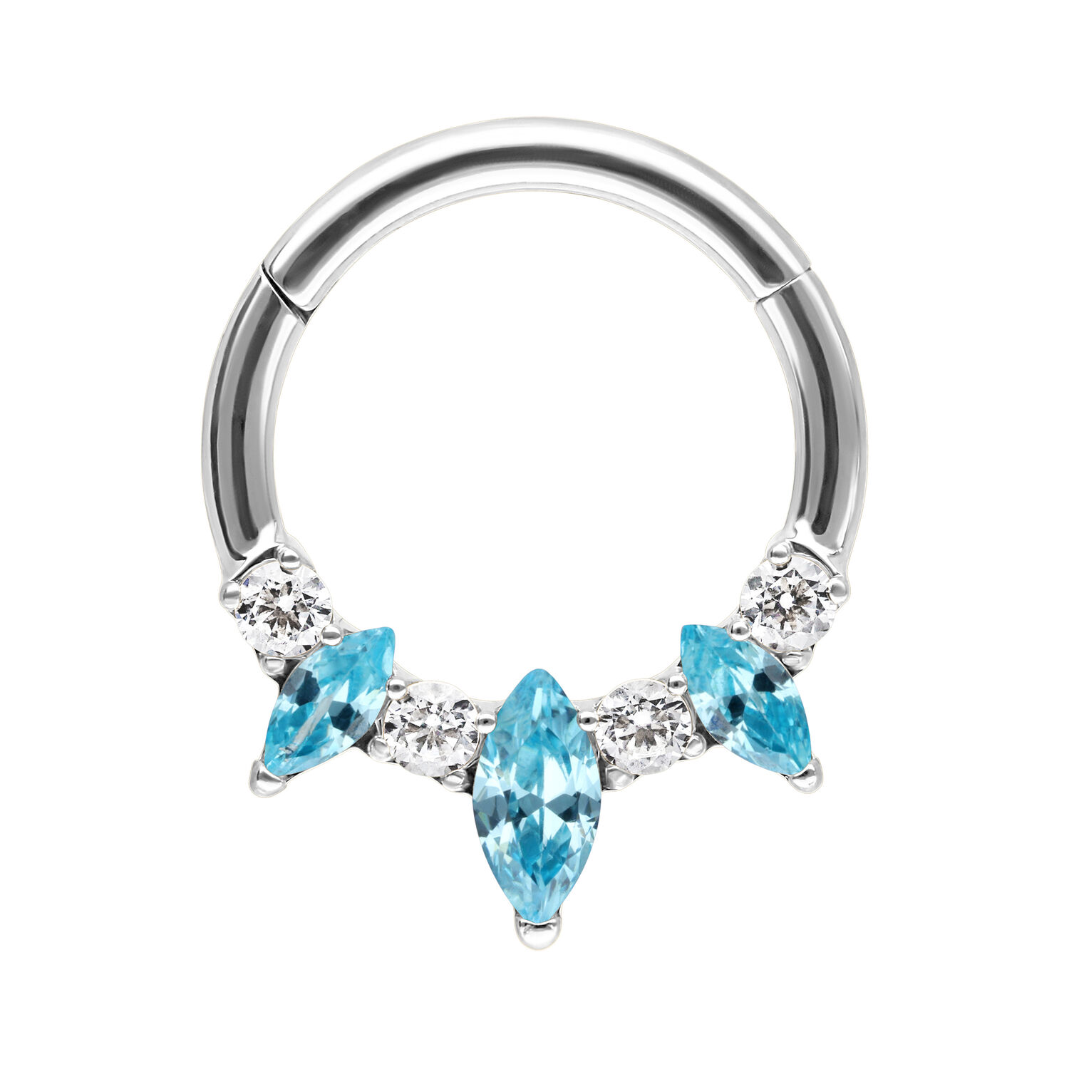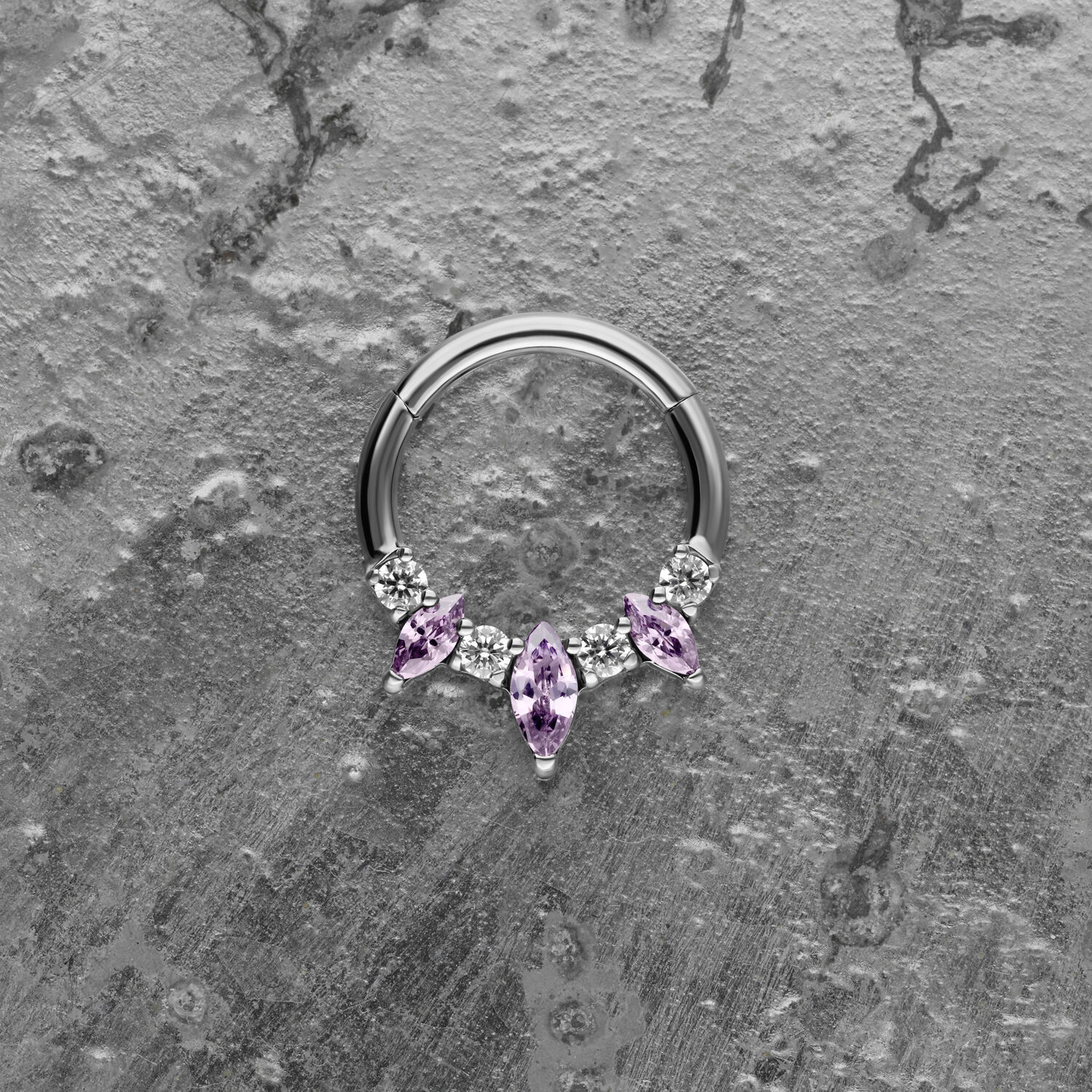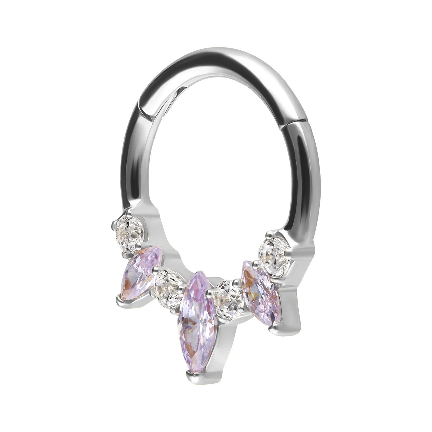Our Marquise Hinged Septum Clicker is made from high-quality stainless steel and is ideal for your septum or Daith piercing. The piercing features a curved hinge bar, allowing for easy handling when inserting the piercing – all without any help.