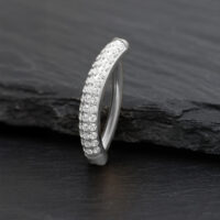 The Multi Jewelled Belly Arch Clicker highlights the navel with an elegantly curved shape and multiple carefully set decorative elements. Their balanced arrangement creates a striking sparkle that enhances the smooth arch of the clicker.